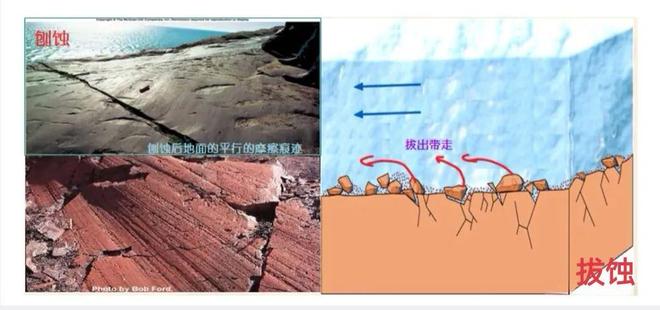 3.冰蚀作用:冰川在运动过程中对基岩的拔蚀(冻结-松动-拔起)和磨蚀(携带的岩屑磨损基岩)。