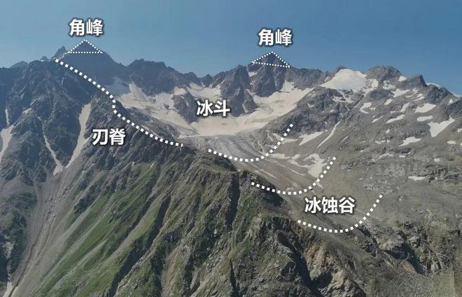 (3)意义:冰斗底部高度常指示古雪线位置。多个冰斗发育可形成角峰、刃脊。