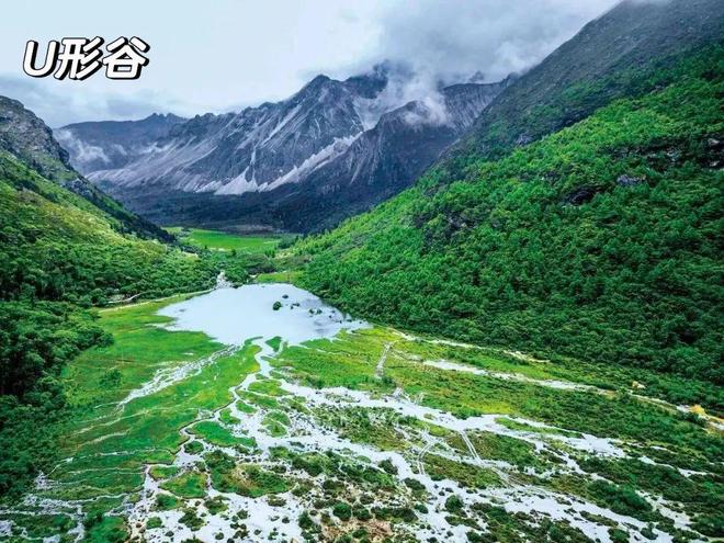 (2)形成过程:冰川占据原有V型河谷(常为河流侵蚀形成)→ 冰川的侧蚀作用拓宽河谷 → 底蚀作用加深、磨平谷底 → 形成U型谷。冰川消退后显露。