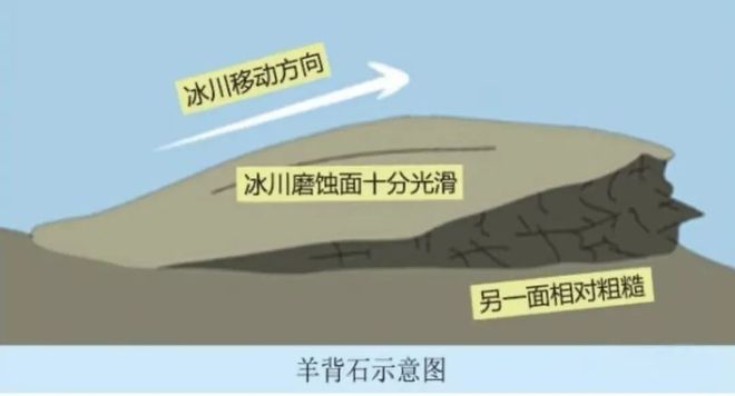 (2)形成过程:冰川流经基岩凸起 → 迎冰面磨蚀作用为主(磨光、擦痕)→ 背冰面拔蚀作用为主(形成陡坎、破裂)。